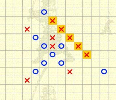 - Một hàng đã có 4 nước nhưng bị phân cách bởi 1 ô trống tại giữa, như vậy tức khắc bạn phải chặn vào ô trống đấy nếu không là thua rồi.